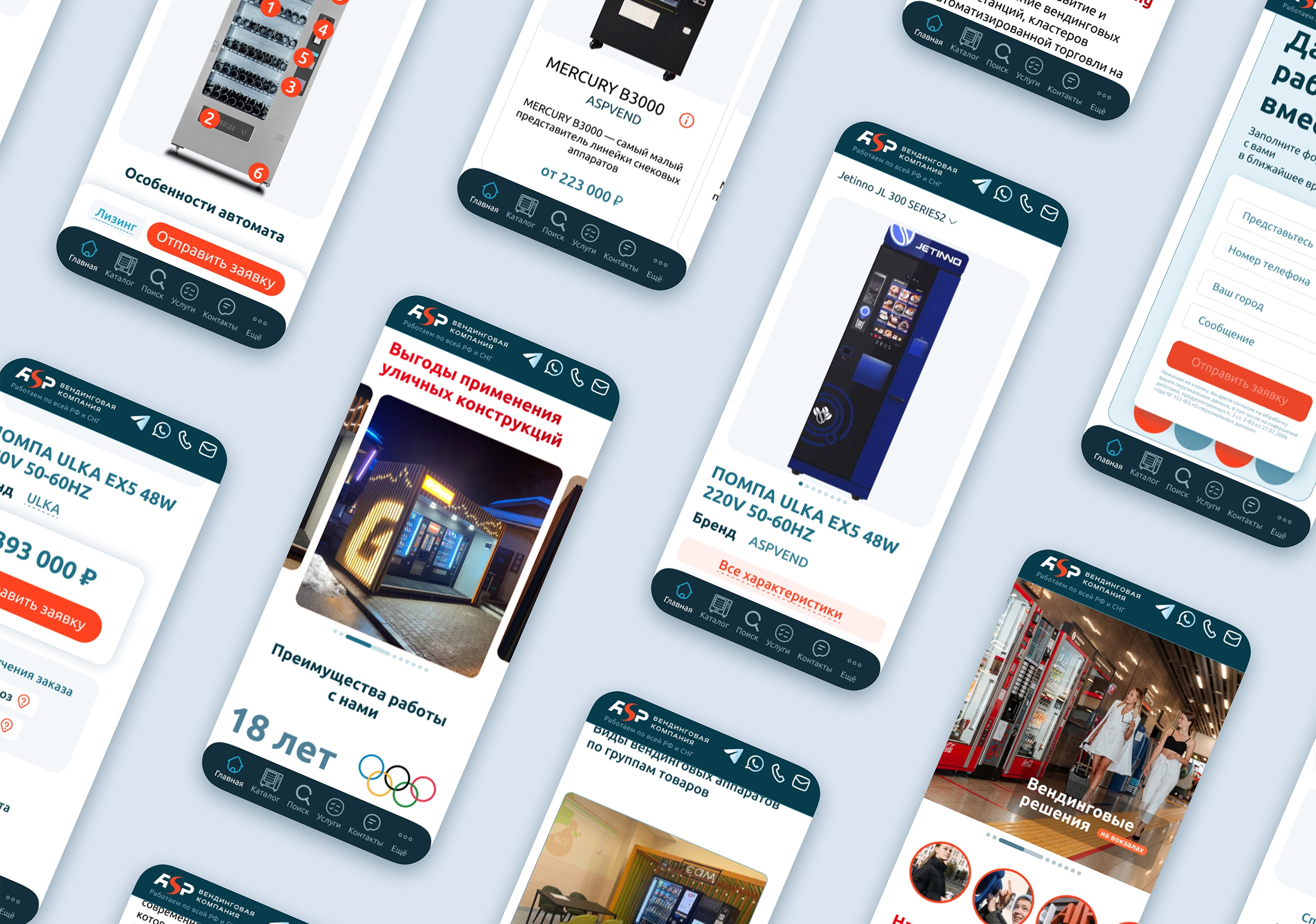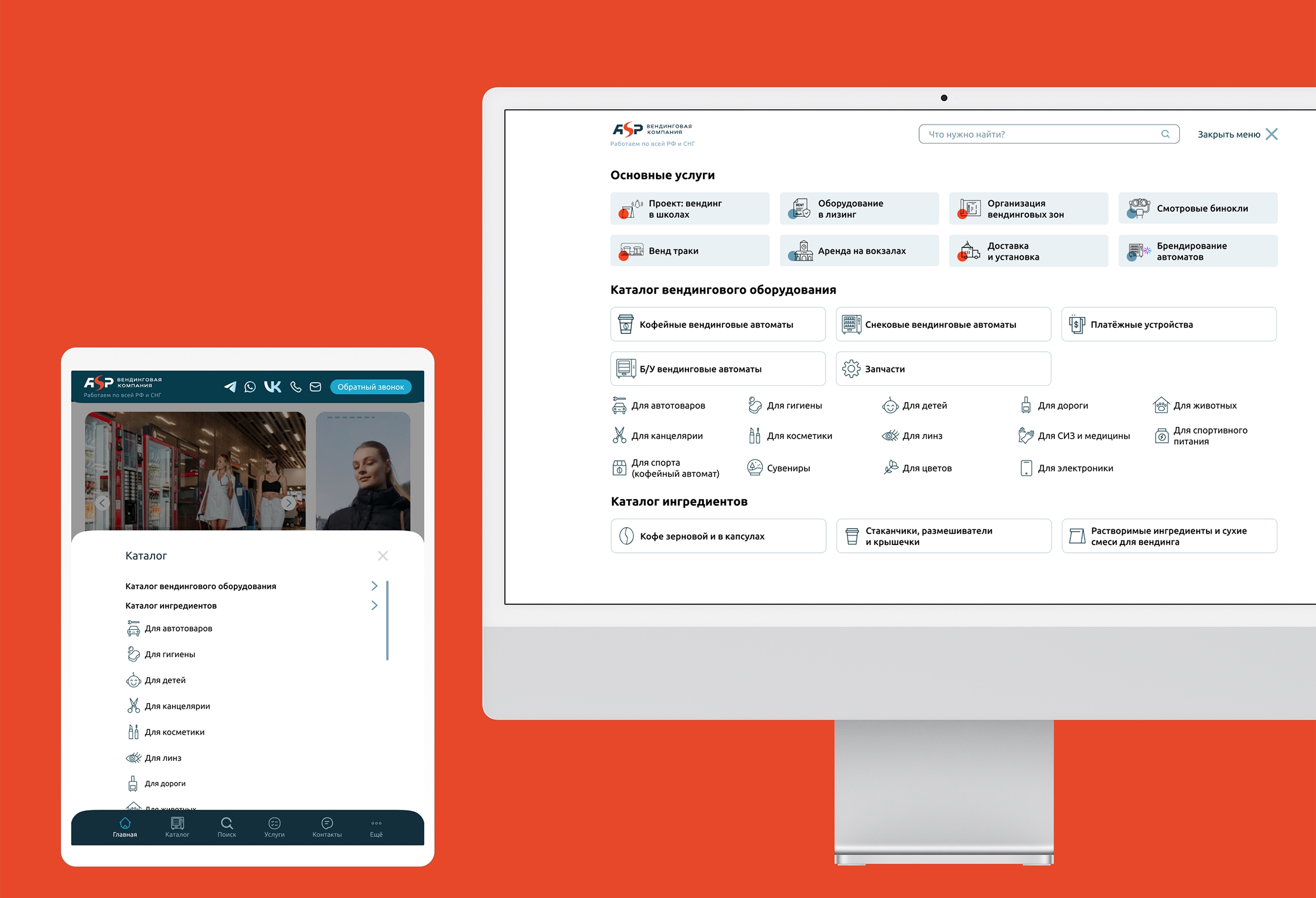 По мере расширения ассортимента товаров и услуг мы внедрили продуманную навигационную систему — полноценное меню для десктопных устройств и нижний бар для мобильных, обеспечивающий удобный доступ ко всем направлениям деятельности.