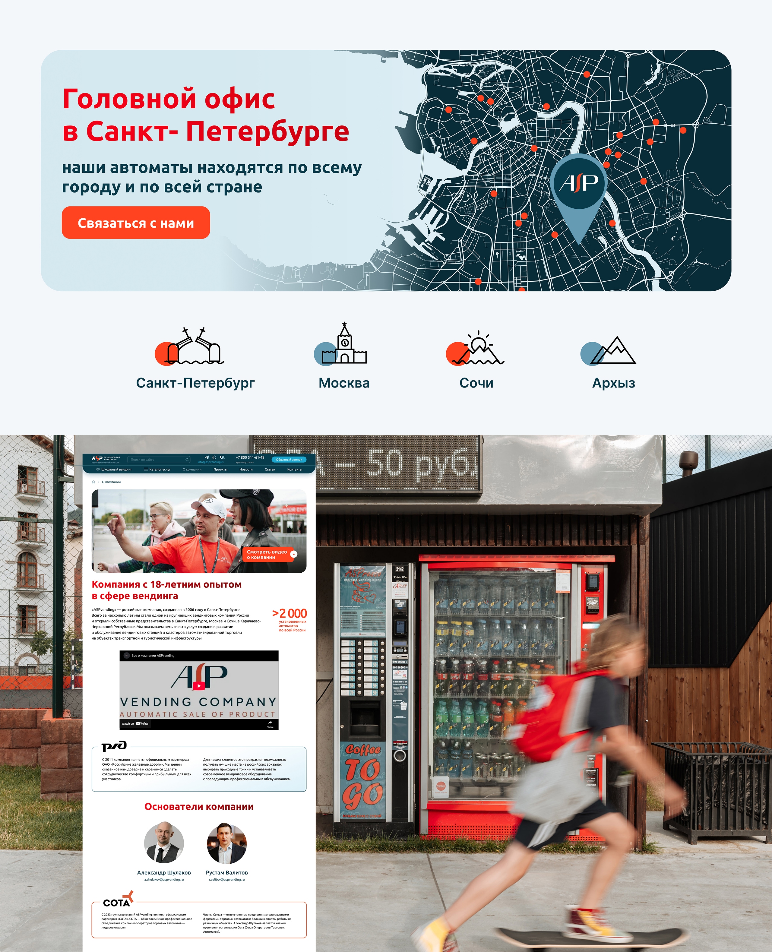 ASP Vending осуществляет проектирование, развёртывание и комплексное обслуживание сети вендинговых станций на территории России.