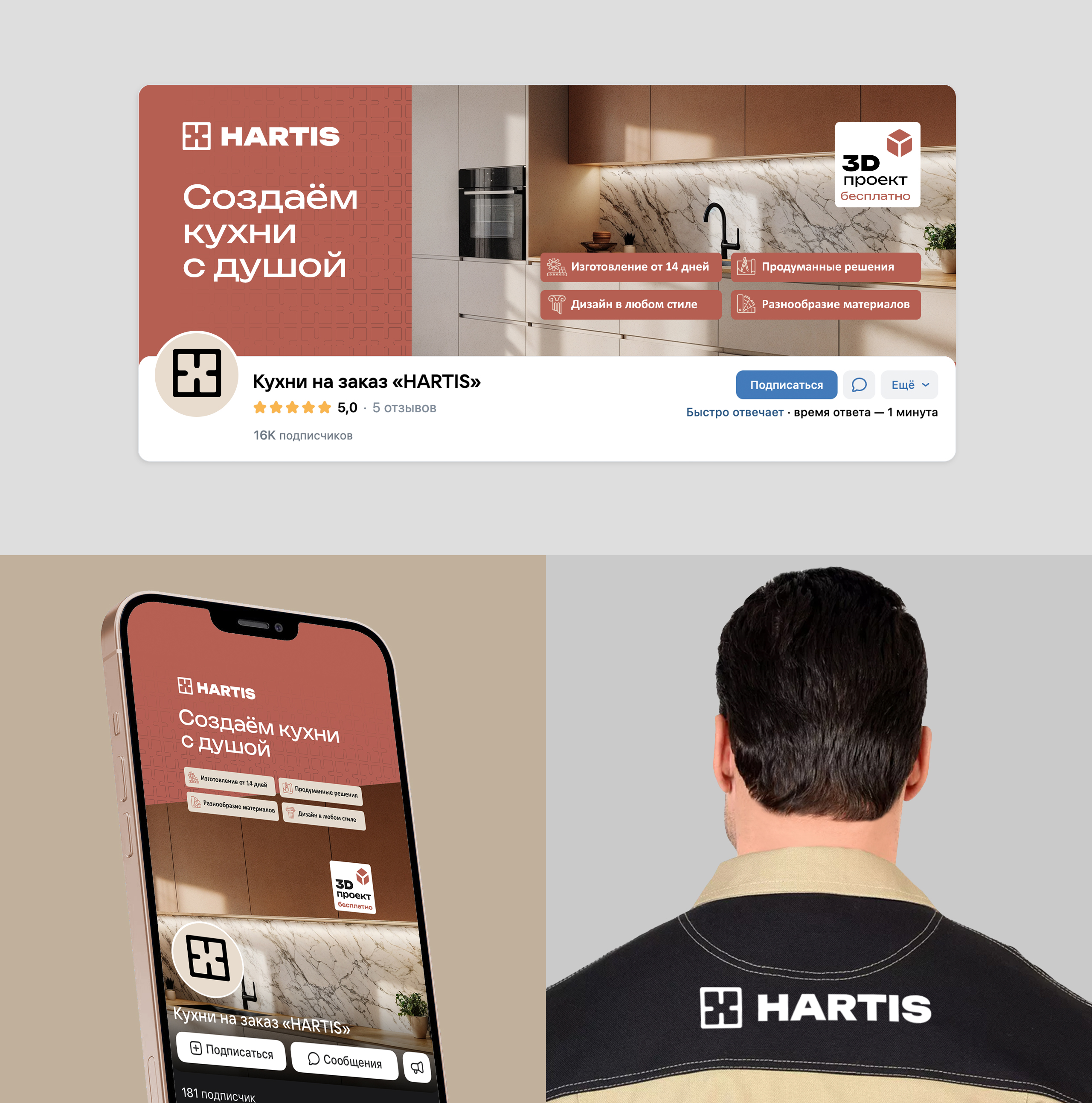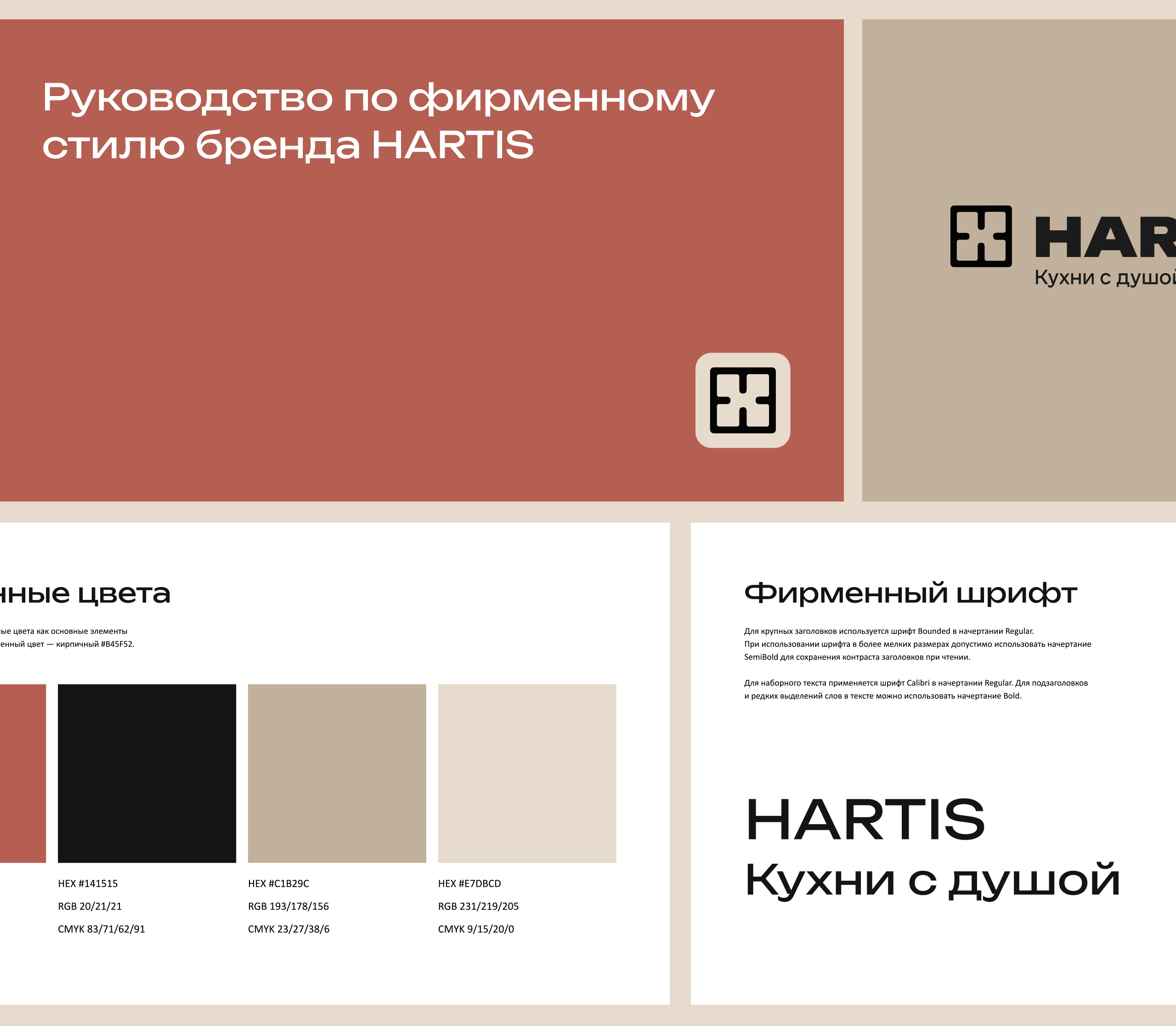 Название HARTIS — это сочетание английского heart (сердце) и «артис» (искусство): кухни, созданные с душой и мастерством. Логотип отражает эту идею — в нём простота, тёплый характер и намёк на ручную работу, подчёркивающий индивидуальный подход к каждому проекту.