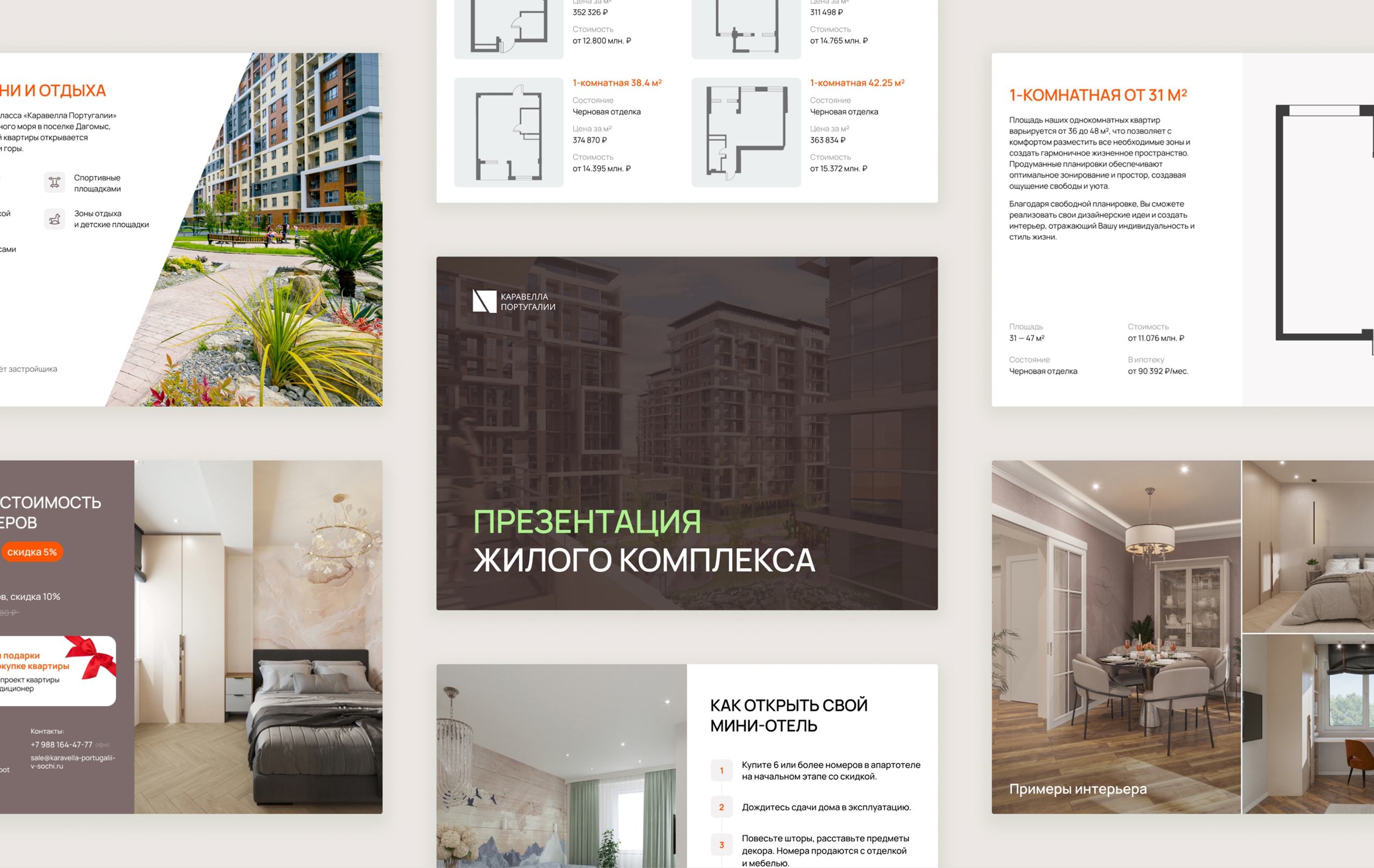 Дополнительно разработали дизайн буклета, который получают посетители после перехода в Telegram. Он расширяет информацию с сайта, подробно представляя планировки квартир и варианты интерьерных решений.