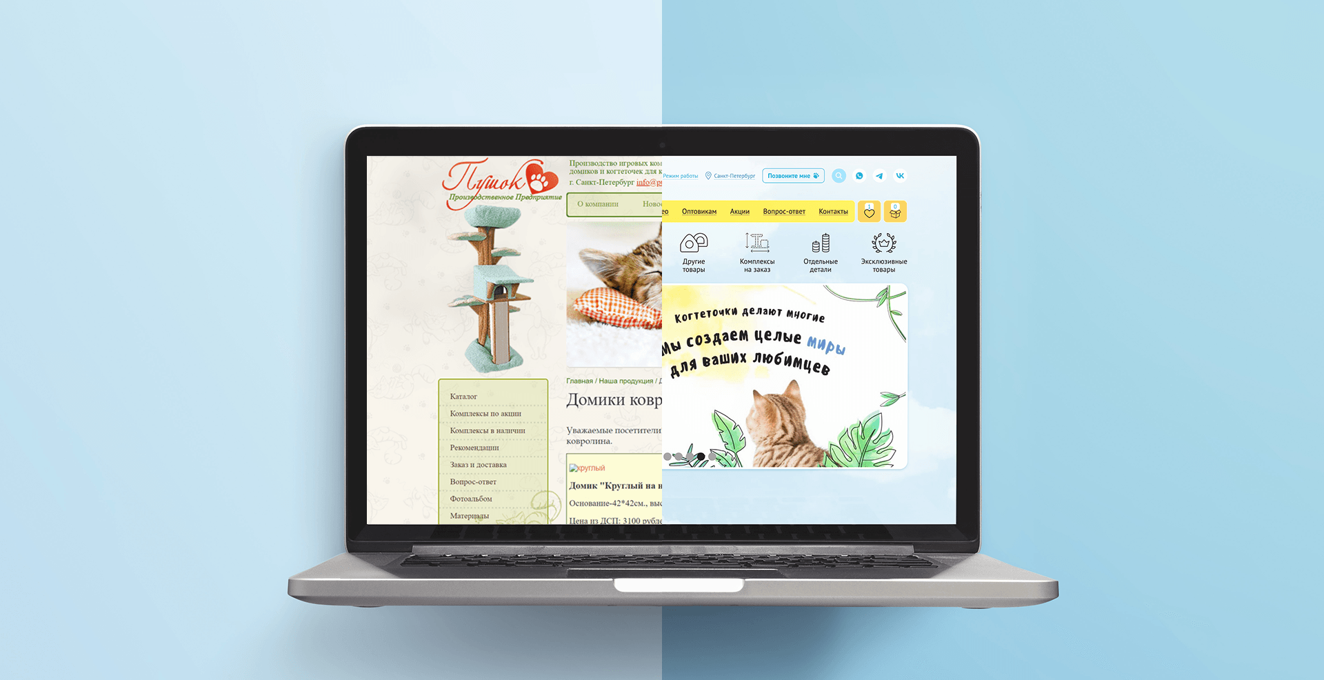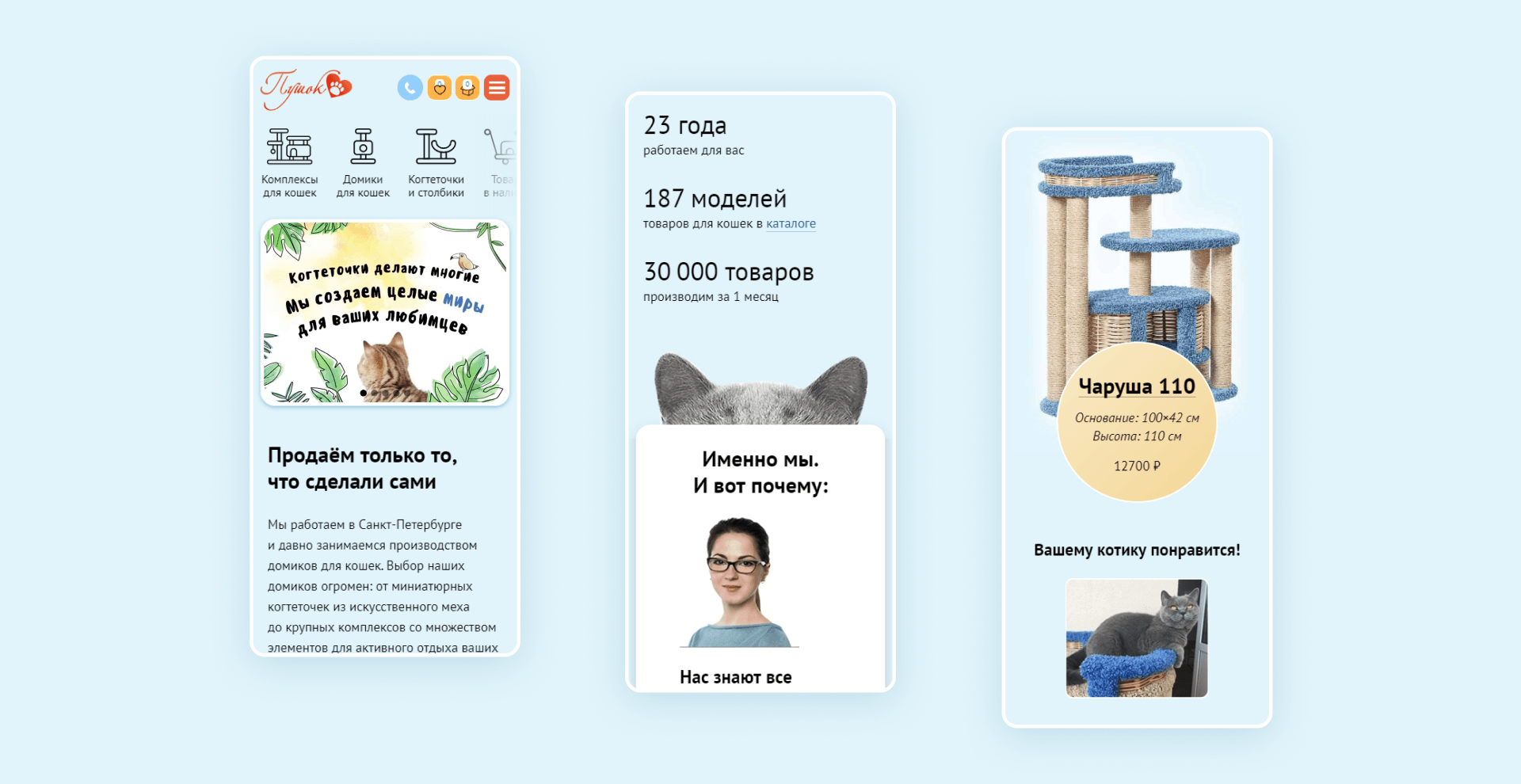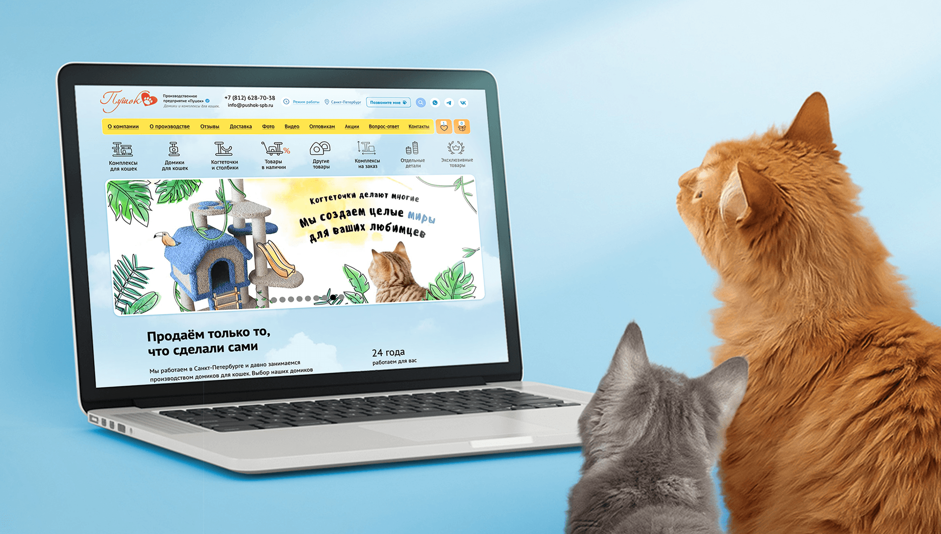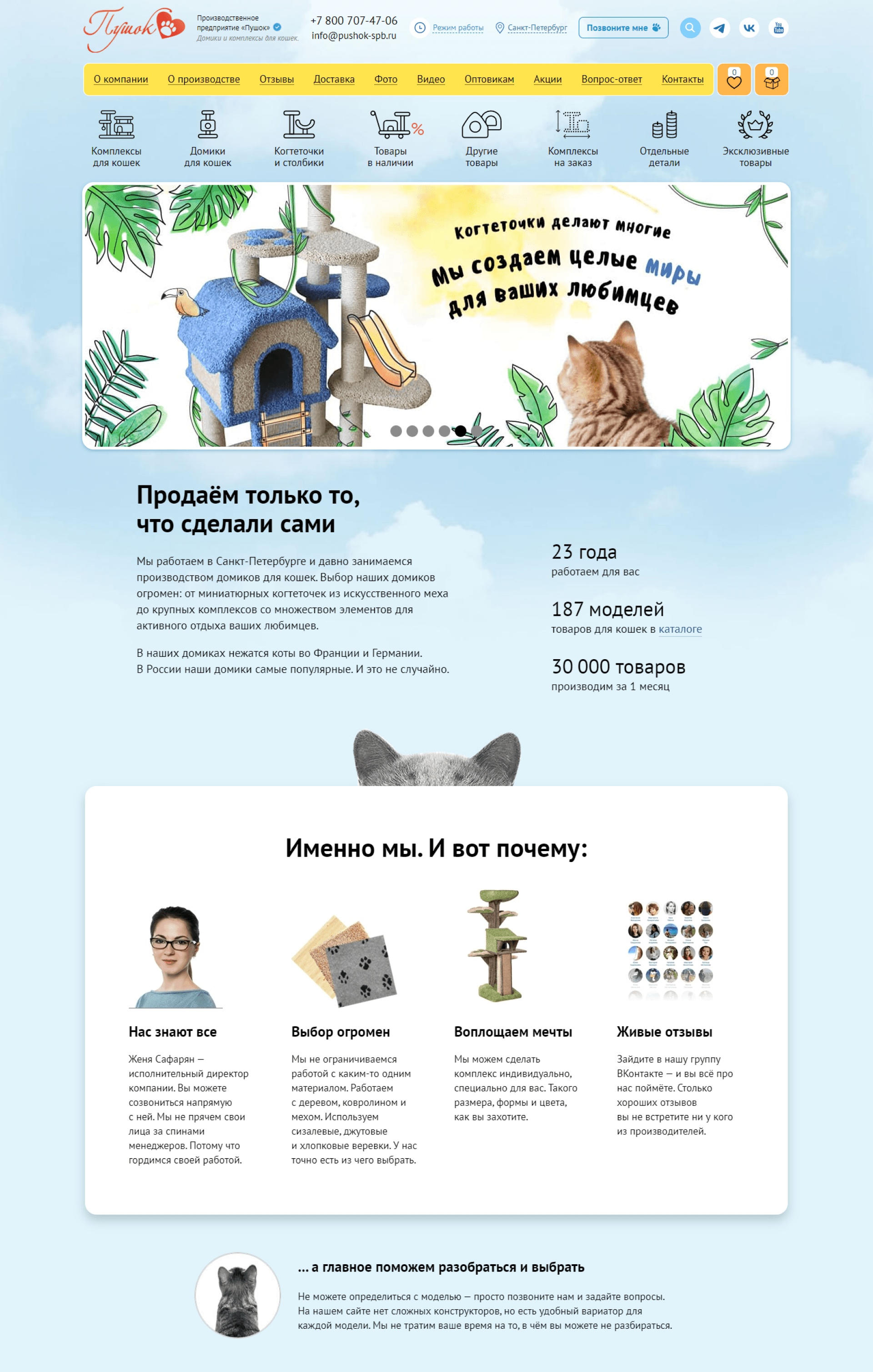 Так как на прежнем сайте у клиентов интернет-магазина не было возможности посмотреть фотографии домиков и комплексов для кошек (что значительно снижало конверсию): мы приняли решение провести фото и видеосъёмки производства и всех товаров, предложенных на сайте.