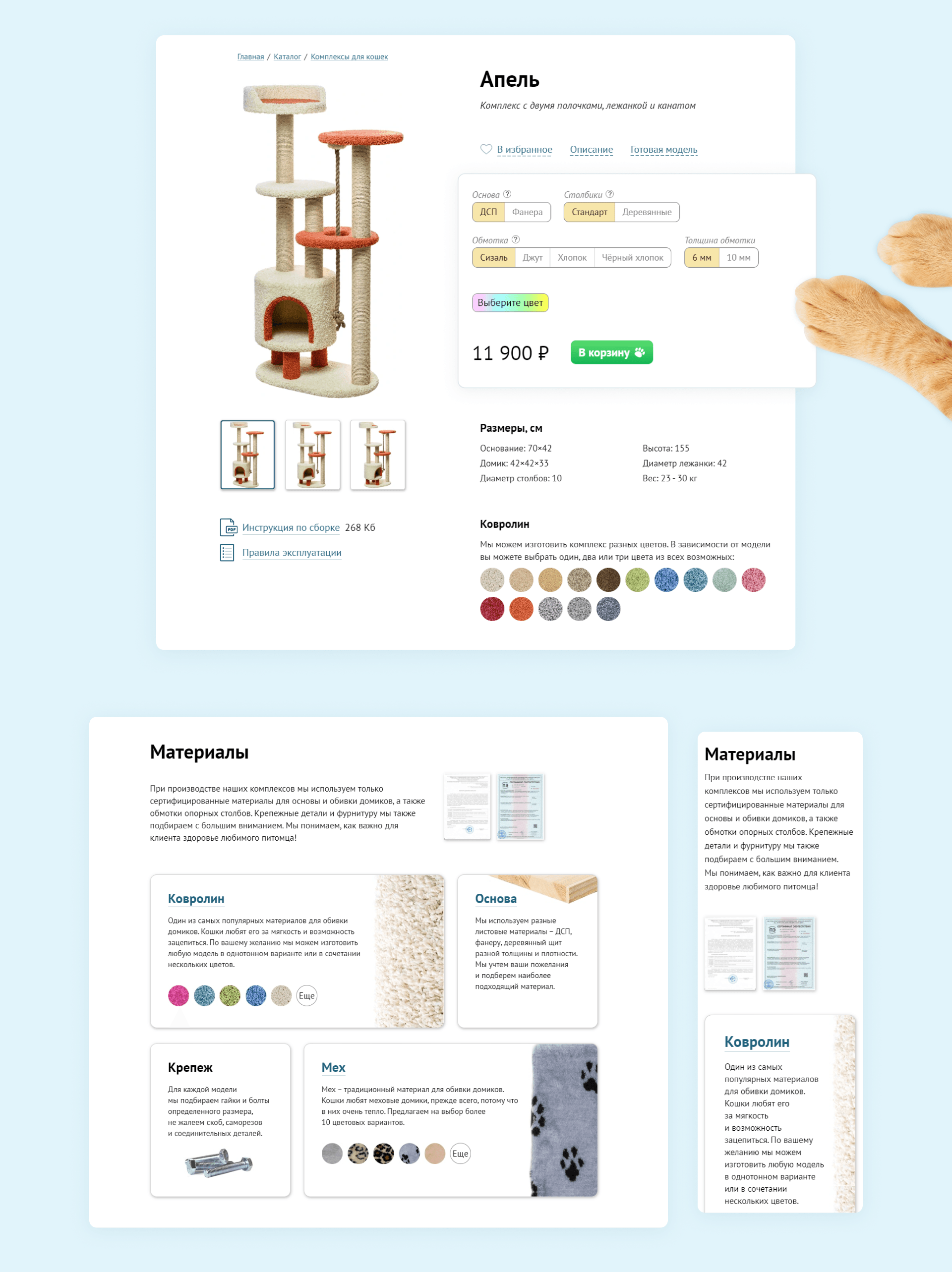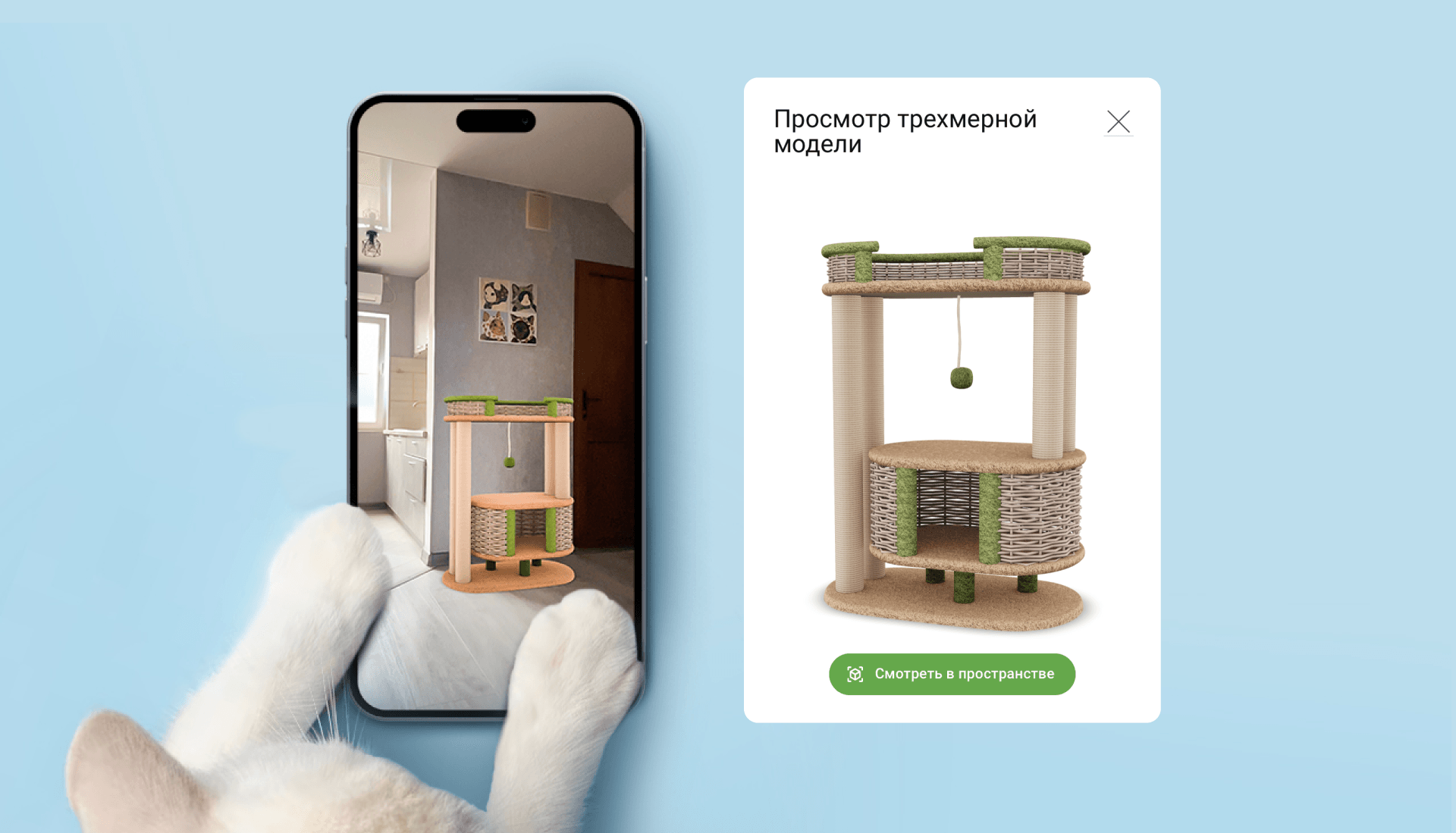 Одним из наших креативных технических решений является создание 3D-вариатора комплексов для питомцев. Он позволяет в пару кликов увидеть, как будет смотреться домик в интерьере! Для комплексов были разработаны 3D- модели, которые можно рассмотреть со всех сторон — и для этого потребуется только навести камеру и указать место.