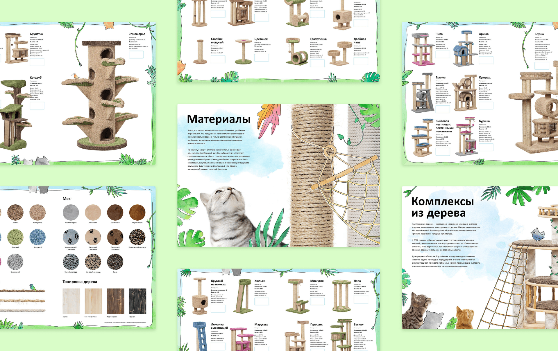 В дополнение к каталогу на сайте мы сделали яркий каталог, в котором использовали фотографии домиков и когтеточек со съёмок.