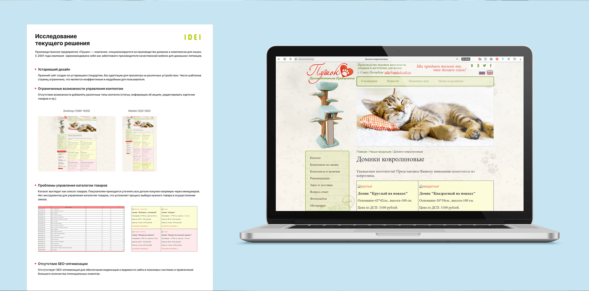 Первым шагом стал тщательный аудит существующего сайта «Пушок» и глубокое погружение в детали проекта. На встречах с заказчиком мы выявили ключевые запросы и цели, которые должен был решить новый интернет-магазин. Основные проблемы, с которыми мы столкнулись, включали устаревший дизайн, ограниченные возможности управления контентом и отсутствие эффективного SEO. Эти выводы легли в основу подробного плана нашего нового проекта.